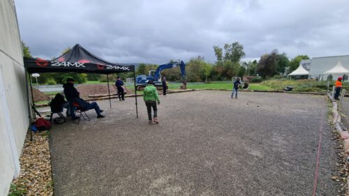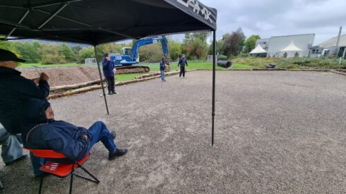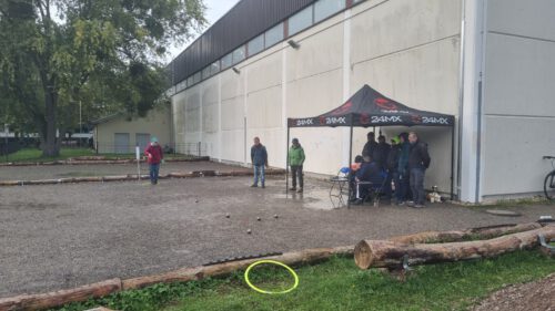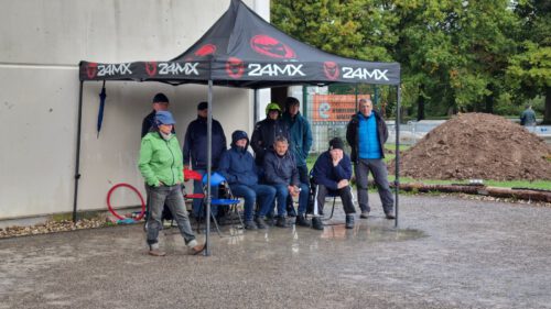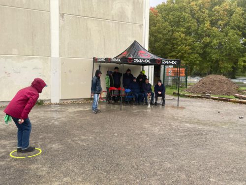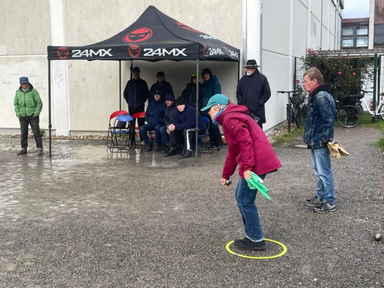 Trotz widriger Wetterverhältnisse – anhaltender Regen und große Wasserpfützen auf dem Platz – ließen sich die Teilnehmerinnen nicht entmutigen. Zuschauer und bereits ausgeschiedene Spielerinnen suchten Schutz unter dem kleinen Pavillon und feuerten die Aktiven dennoch engagiert an.